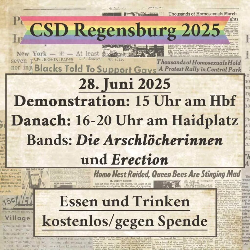 Um 15 Uhr wird dann am Hbf die Demonstration anlässlich des Christopher Street Day 2025 stattfinden, die sich zum Haidplatz bewegt, wo von 16 – 20 Uhr die stationäre CSD-Versammlung stattfindet.
