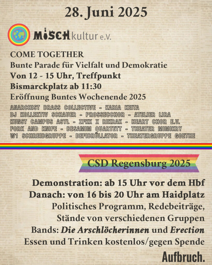 Genug Zeit also, um beide Veranstaltungen zu besuchen und für ein offenes und buntes Regensburg einzustehen!