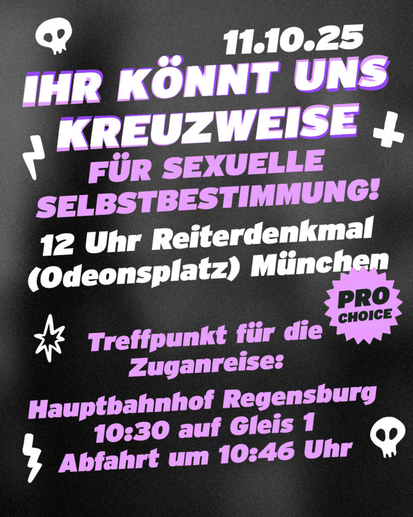 Dass der „1000 Kreuze Marsch“ und auch der „Marsch fürs Leben“ eine Gefahr für gebährfähige Personen und ihre Autonomie darstellen, ist klar! Deshalb rufen wir, das Pro Choice Bündnis, dazu auf sich an den Protesten am 11. Oktober gegen den „1000 Kreuze Marsch“ zu beteiligen. Lasst uns lautstark und entschlossen auf die Straße gehen und den religiösen Fundamentalist*innen die Bühne nehmen!