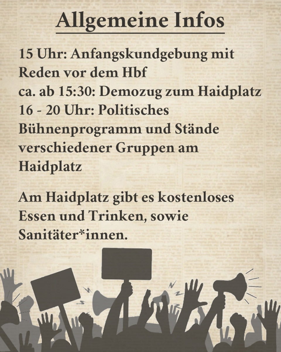 Um 15 Uhr beginnen wir unseren Demozug am Hauptbahnplatz und tragen laut, antikapitalistisch und kämpferisch unsere Forderungen auf die Straße.