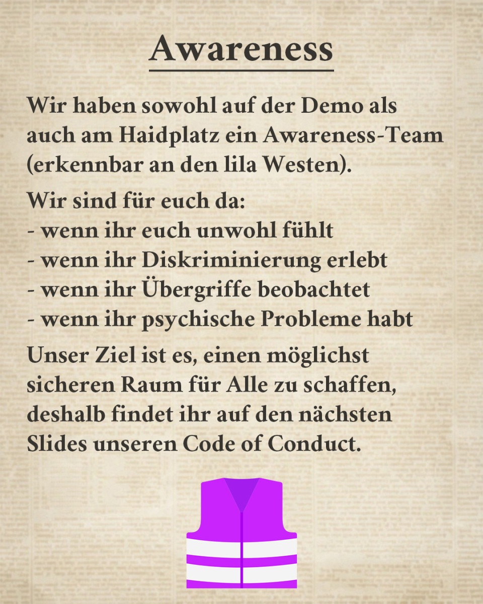 Im Anschluss danach versammeln wir uns von 16 – 20 Uhr am Haidplatz, da gibt es keine Partei- oder Unternehmenswerbung, dafür kostenloses Essen und Trinken, Bands und politisches Programm.