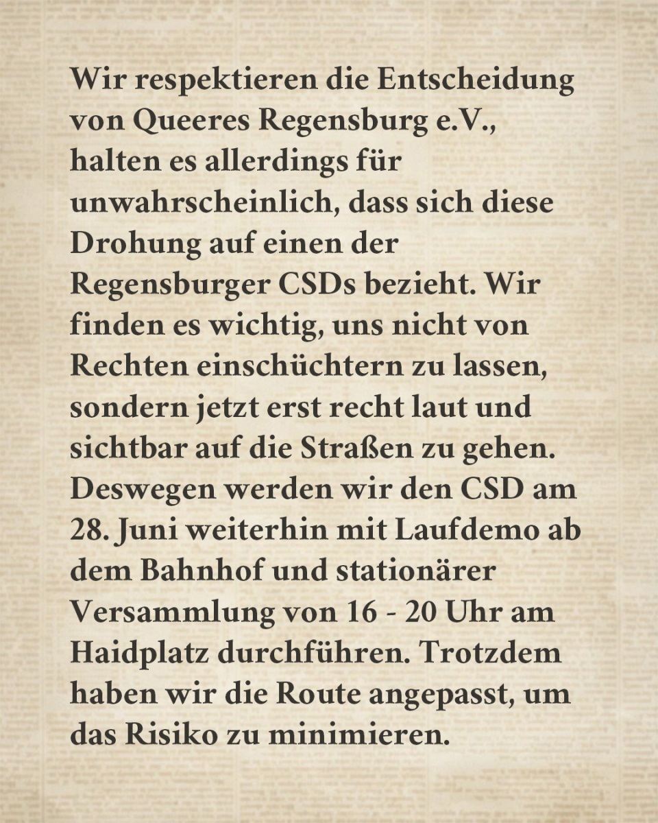 Wir respektieren die Entscheidung von Queeres Regensburg e.V., halten es allerdings für unwahrscheinlich, dass sich diese Drohung auf einen der Regensburger CSDs bezieht. Wir finden es wichtig, uns nicht von Rechten einschüchtern zu lassen, sondern jetzt erst recht laut und sichtbar auf die Straßen zu gehen.